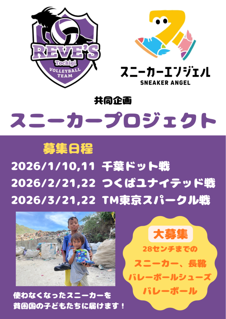 昨年好評だったスニーカープロジェクトを今シーズンも継続頂ける事となりました! 年明けのホームゲームにて使わない靴を集めます。 レーヴィスの試合を観戦しながらフィリピンの子供達に笑顔を届けましょう! -